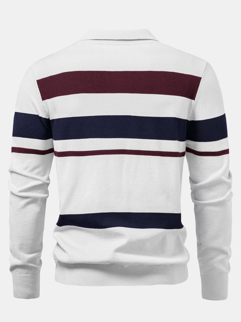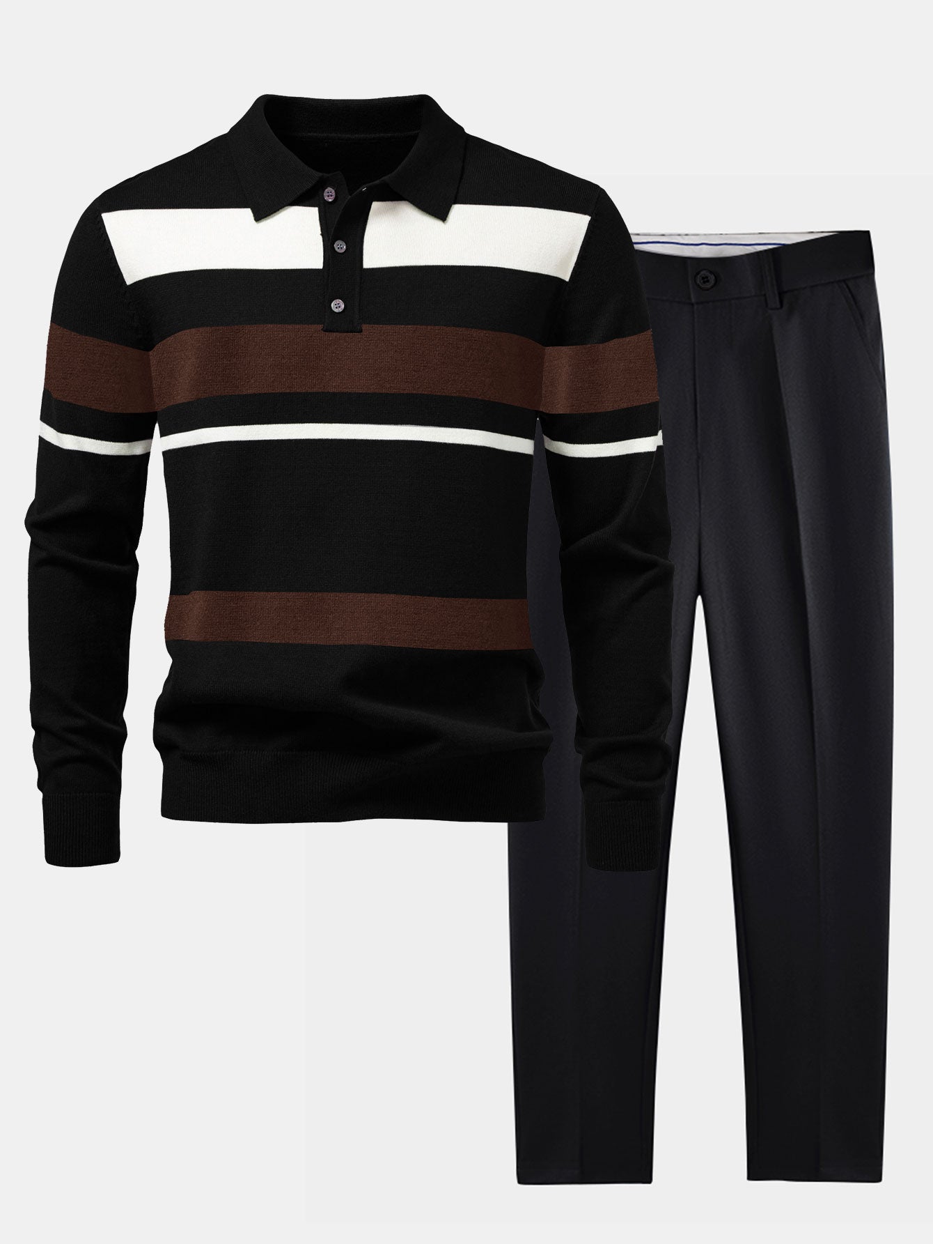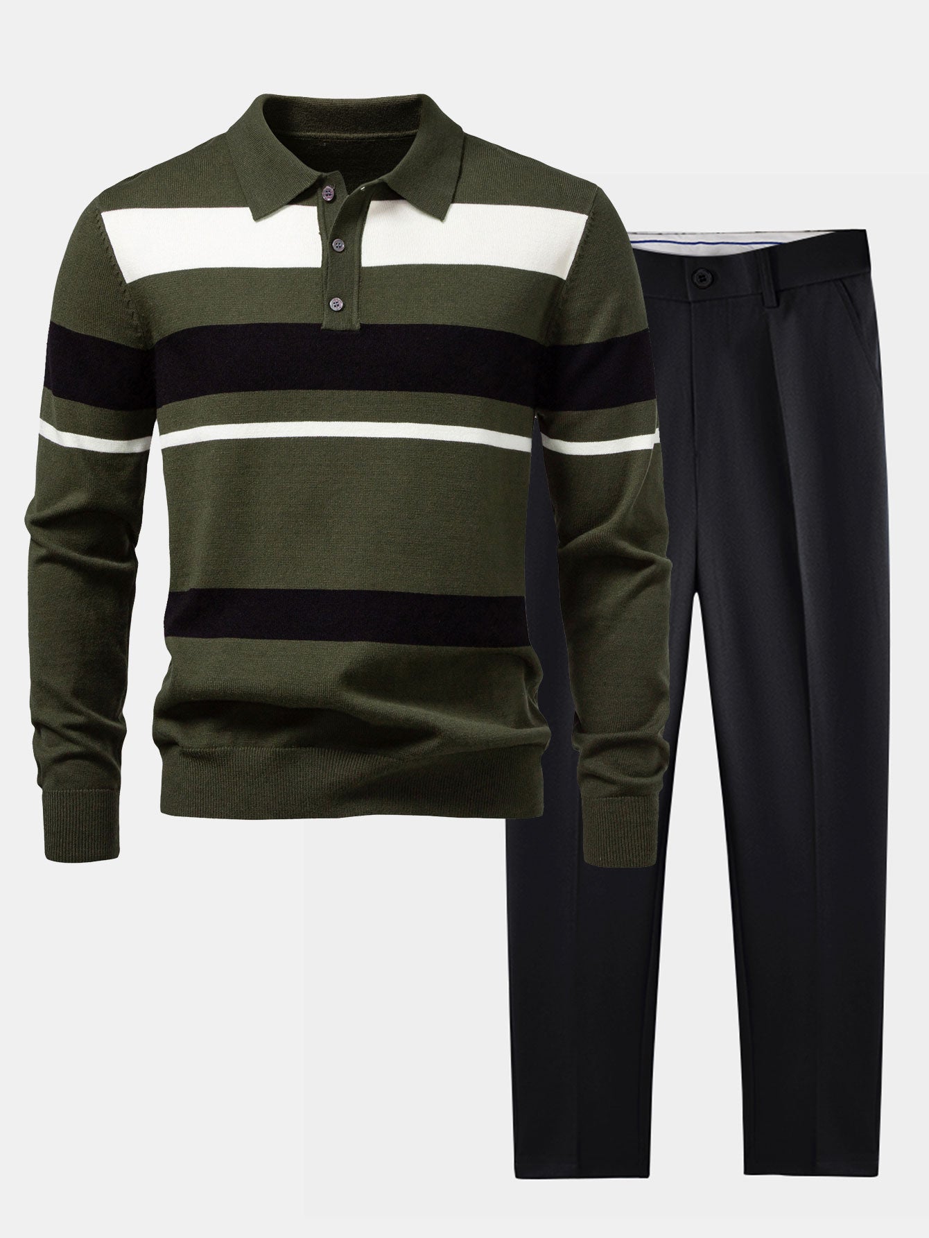 長袖ストライプニットポロシャツ&スリムフィットテーパードトラウザーズ